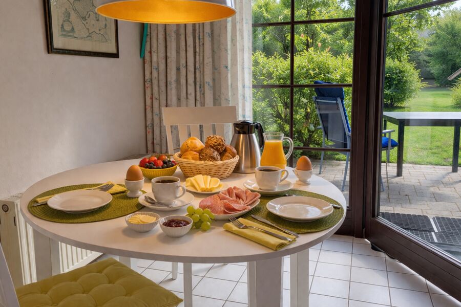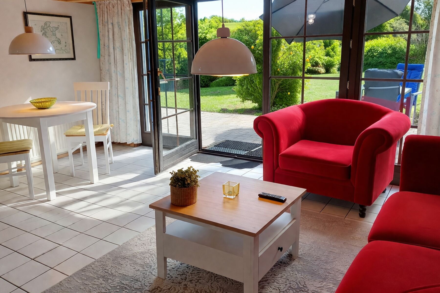 Ihr ca. 50 qm großes freistehendes reetgedecktes Bauernhaus 8RB1 (Nichtraucher) mit typisch niedrigen Raumhöhen ist im Maisonettenstil über 2 Etagen erbaut und mit einer offenen Treppe verbunden. Vor dem Wohnbereich im Erdgeschoss befindet sich eine schöne Südterrasse mit grünem Ausblick auf den eigenen Gartenteil. Im gemütlichen Wohnbereich mit einer Sitzgruppe und einem großem Flatscreen-TV finden Sie neben der angrenzenden Wohnküche auch einen Essbereich. Im Küchenbereich erwartet Sie ein einen Backofen, Kühlschrank, eine Kaffeemaschine, Wasserkocher sowie weitere nützliche Küchenhelfer. Ebenfalls im Erdgeschoss befindet sich das Badezimmer mit Dusche, Waschtisch und WC. Im Obergeschoss finden Sie den Schlafbereich mit Doppelbett und Kleiderschrank. Auch ein Kinderreisebett würde dort Platz finden. Durch den umzäunten eigenen Garten und die grüne Umgebung ist diese Wohnung perfekt für Kinder und Haustiere geeignet.