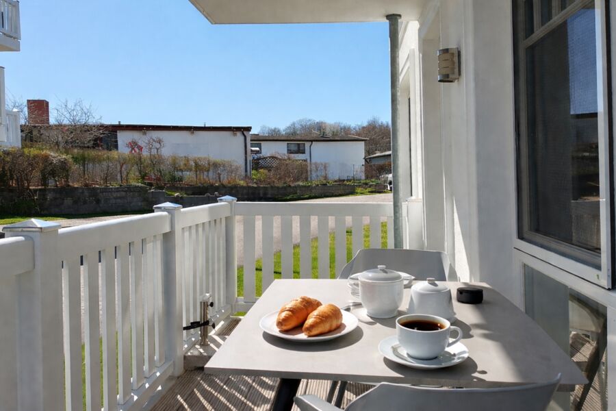 Vom Wohnbereich gelangen Sie auf den möblierten Balkon mit Blick auf den Innenhof.